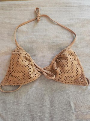These is a cute top! I actually should have dozed down as the small seems very big. I love the crochet pattern. It's a typical bikini top where it ties on the next and back. The light color brown is pretty.