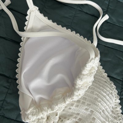 This triangle swimsuit top is absolutely adorable! It has nice thickness to prevent it from becoming see through when wet and the crochet overlay adds nice texture and style. The strings are flat and stretchy which is a good combination for remaining tied while wearing.