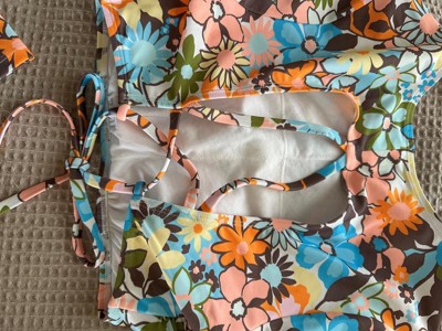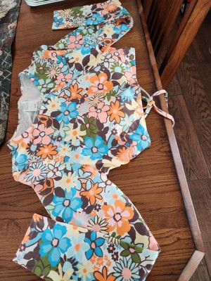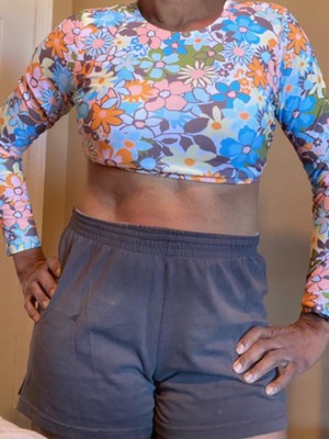I love that this is a long sleeve swim top - Great for preventing sunburn! The back tie is cute, but I don't feel like it holds the top down very good if you were jumping around in the water. The colors and print are muted and fun - 60s vibes.