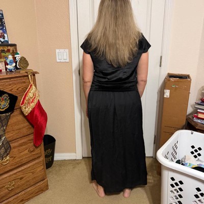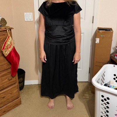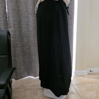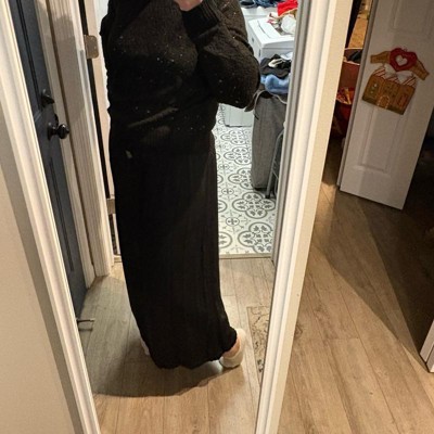 [This review was collected as part of a promotion.] I am 5’4 and about 140 pounds. I tried on this skirt in a size medium. It is comfortable on the waist and works well for me lengthwise which isn’t always the case for me with full length dresses or skirts. Overall I’d say it runs true to size. It’s okay. It doesn’t have a lot of shape although the side slit gives it nice detail. It is versatile given that it is a basic black skirt and could be dressed up or down.