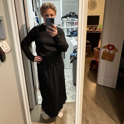 [This review was collected as part of a promotion.] I am 5’4 and about 140 pounds. I tried on this skirt in a size medium. It is comfortable on the waist and works well for me lengthwise which isn’t always the case for me with full length dresses or skirts. Overall I’d say it runs true to size. It’s okay. It doesn’t have a lot of shape although the side slit gives it nice detail. It is versatile given that it is a basic black skirt and could be dressed up or down.