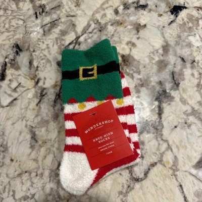Step into festive fun with stylish these Women's Elf Christmas Knee High Socks with Feather Yarn Cuff - Wondershop™ Green/Red/White 4-10. These vibrant socks are crafted from a blend of polyester, nylon, and spandex, offering a comfortable fit for adults in sizes 4-10. The charming multicolored stripe pattern really stands out, and the soft feather yarn cuff adds a cozy element to your ensemble. Enjoy the celebration-ready design that is both midweight and tagless, ensuring all-day comfort.