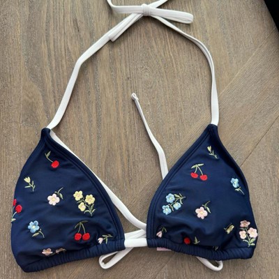 [This review was collected as part of a promotion.] This is the wild fable embroidered cherry and flower medium coverage triangle bikini top in size small color is navy. I am 5‘4“ tall and about 135 pounds and typically wear a size small. This top fits great, I really like that. It has removable pads. I love the embroidery that’s on it. And the fact that the triangles are adjustable across the chest. I do recommend this top. it’s super cute and fun. I received an incentive to write this review.