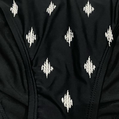 [This review was collected as part of a promotion.] This is a size medium and runs a little small. I would size up one. The material is thicker and seems well made. There are diamond shapes all over and these are textured. They seem like they were sewn on and are made of larger stitches. It just seems like a well made suit and will hold up. There is a matching top you can purchase separately.