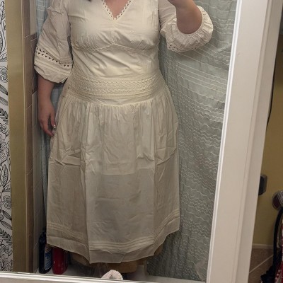 I love everything about this skirt except for two significant points detailed below. The little scallop details are charming and fit my personal taste. The smocking makes it more accessible and comfortable if your weight fluctuates. The material is all cotton, not plastic aka polyester found in so much clothing. The cons: — no pockets, I don’t understand why they were omitted in this design. — one of the most inane construction choices I’ve ever seen for the lining. The skirt reaches well past the knee and does have a slit on one side to just above the knee. So do many, many other skirts. But instead of lining it fully with a corresponding slit, or not lining it at all, designers have decided to pinch pennies while protecting their profit margin by giving this skirt a not-even-halfway-down “lining”. This skirt material is thin, being somewhere between a cotton lawn and cotton poplin weight. In the white version of the skirt, you can absolutely see the ridiculous line of the “lining” right across your lap. I know a lot of cheap clothes are made with shortened linings, particularly ones with lace on top, but that’s different from what I’m talking about here. That saves money, yes, but it also works as an aesthetic design choice. That is *not* the same as what’s being done here. This is either lazy construction and/or a way to cut costs and labor. I’ll end by saying I am keeping the skirt because it fits me, and my choices across the board at Target are limited anyways being plus sized especially in styles I like. Also, I know how to sew (kind of have to when stores don’t always have options for you) and have the skill to be able to fix the issue—but my review and critiques are for those who don’t. The easiest fix even if you have no sewing experience is cut the thing out, but at that point I’d wait if you can until the price lowers or the line goes on sale. Wear a slip/petticoat/under dress under it, yes, you’ll see it through the side slit, but this is the kind of concession needed when the original design fails in this respect.