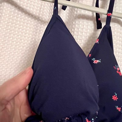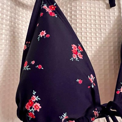 Triangle bikini top from Wild Fable™ with a front-tie accent. Adorned with vibrant floral prints against a navy blue backdrop. Made from nylon fabric with spandex and full lining for flexible comfort in and out of the water. Adjustable back and behind-neck ties complete the look and provide a customizable fit.