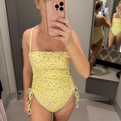 Such a cute swimsuit. For reference, I’m 5’3”, about 120 lbs, and a 32DD, and I’m actually wearing a size medium in this one. It does run a little small, so I’d recommend sizing up if you’re between sizes or want a little more room. The side ties are adjustable which is really nice, and the yellow floral print is so flattering for spring break or summer.