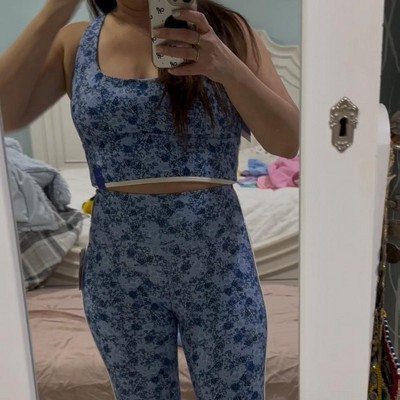I love these leggings so much. The blue with the matching sports bra is adorable. I would say they fit TTS. Sometimes I size up in athletic gear so it’s not so tight, but my true size M fit really well and wasn’t too constricting. I do intense workouts where I get very sweaty, so it is super important for me that leggings not show sweat in the crotch/butt area. I did a comparison with a wet cloth to Aerie real me leggings which I love, but non-black colors do show sweat. These leggings didn’t show any wetness at all! Will def be looking at Joy Lab leggings more in the future.