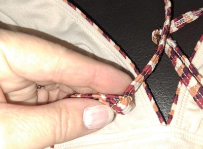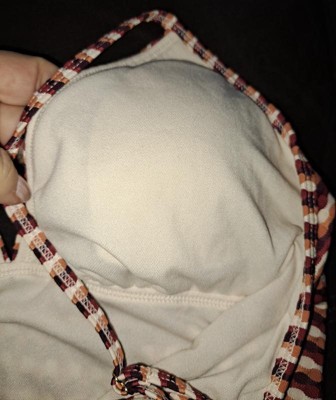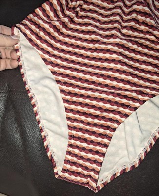 This swimsuit has warm colors, brown, terracotta, a clay color and an off white. This will look great on lots of skin tones, just not my cool undertones. Nice metal slides for adjustibility. High leg opening and a low plunging neck. Lined bra area for modesty. Thick seam in the back which might be uncomfortable.