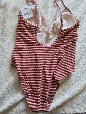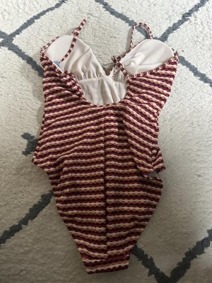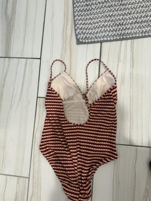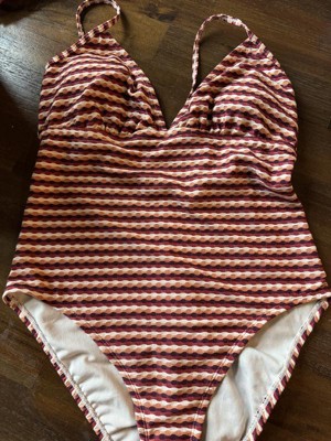 When I think of red, this is not what comes to mind. This Women's Geo Jacquard Full Coverage One Piece Swimsuit - Shade & Shore™ in Red Multicolor runs a little small. The print is not something I would choose. The midsection does have great compression for the tummy. Advertised as full coverage and I would say it’s more medium coverage(possible skewed because it runs small).