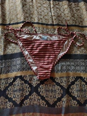 I like this bikini bottom. It’s cheeky but not too cheeky. It fits well and is comfortable. I like the color, style and texture of the fabric. The texture of the fabric actually helps to keep the straps from losing on their own. I have a regular swimsuit texture bottom like this and the straps kept undoing themselves. The texture makes the difference. I like it. I actually got it to go with a red swim top I have but sadly not the right red. Oh well. The search goes on.