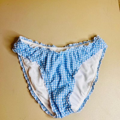Seersucker bikini bottom from Wild Fable™ adorned with a gingham pattern and slim ruffle-trim accents. Features pull-on style for convenient wear. Made from recycled polyester-nylon blend fabric with spandex and full lining for flexible comfort in and out of the water. Medium coverage and a low-rise, high-leg silhouette finish off the chic look.