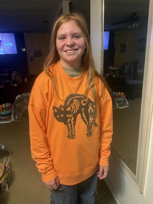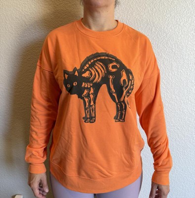 I absolutely love this Women's Halloween Skeleton Black Cat Fleece Pajama Sweatshirt by Hyde and EEK! Boutique in the color Orange size Small. Let me just say this is so incredibly soft and feels so comfortable wearing it. I know this is a sleep sweatshirt but I would wear this out and about, there is no way to tell it is a sleep sweatshirt. The design of the cat is the perfect taste of Halloween. The orange is spot on Halloween pumpkin orange. I have no complaints. The sweater is slightly larger than true to size which is perfect for sweatshirts. Overall this is a must buy.