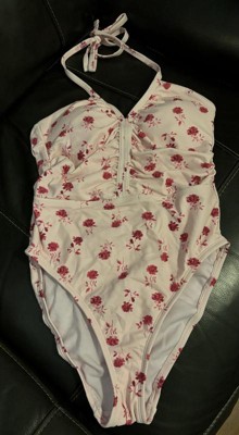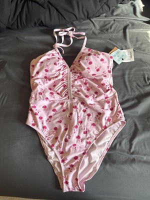 Women's Halter Shirred Plunge Neck Medium Coverage One Piece Swimsuit - Shade & Shore™ Pink Rose Print 16: Recycled Polyester