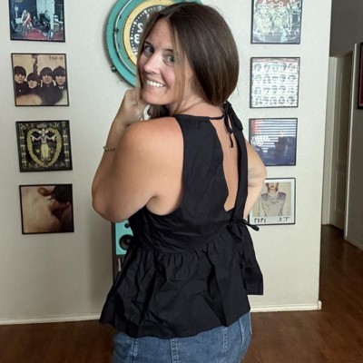 [This review was collected as part of a promotion.] This is such a chic, unique and easy to wear high neck babydoll halter top from Wild Fable. The cotton-recycled fabric is light and airy and makes the top perfect for summer. It pairs perfectly with jeans for brunch or a night out. The open back is fun and different. The fit of the top is great and I’m wearing my usual size large. My measurements are 33 inch waist and 41 inch hips. I received an incentive to write this review.