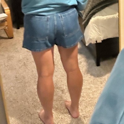 [This review was collected as part of a promotion.] This pair of denim shorts is a unique and uncommon denim blue but, I personally like the shade. It has cleats on the front and a zipper closure with a single button. It also comes with belt loops if needed or wanted. The back of the shorts has two functioning pockets. I would say that these shorts run true to size. I am a size 10 and that is what I am wearing. they are a great link and not too short! I received an incentive to write this review.