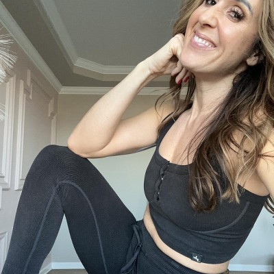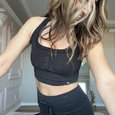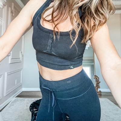 This set is unlike anything I have. It’s a thick stretchy ribbed material and not something I would personally workout in, but love it for errands or taking the kids to the park. I got my true to size medium in the leggings. I also would normally steer clear of gray on the bottom but the thick and heathered material is very forgiving.