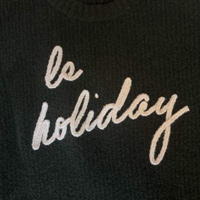 [This review was collected as part of a promotion.] I am wearing an extra extra large in this holiday sweater that is a dark green. I am normally a size 10/12 but sized up for a oversized look I love the feel of the sweater. It was very soft and it was perfect for the Christmas holiday, the white wording be Holiday was adorable and everybody loved it .