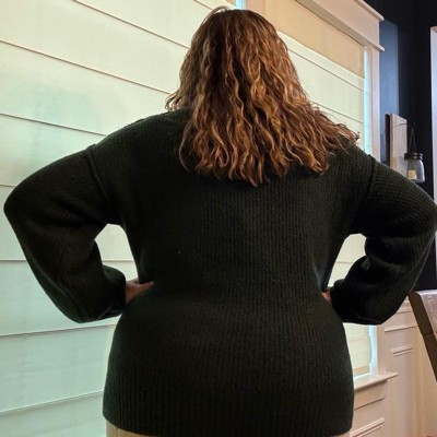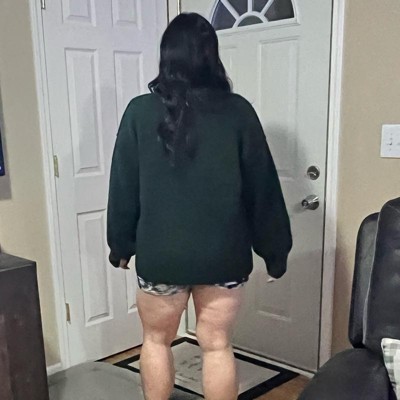 [This review was collected as part of a promotion.] I am completely obsessed with this weather and so excited about wearing this for the holiday season. The green color is deep and pretty and this fits true to size I pictured her wearing a size XXL and overall this fit perfectly. The sweater is warm and stretchy and I can wear it by itself because it’s not scratchy. It would also layer underneath of a turtleneck or a T-shirt for another look.