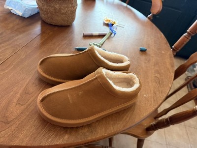 Great slippers.Very comfortable. Look nice and great soles if worn outdoors. They run slightly small, if you run a half size I would suggest sizing up.