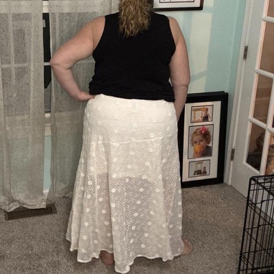 [This review was collected as part of a promotion.] I am a current size 14 and really like this lace long skirt. It has a sheer panel underneath in a miniskirt type size to cover your most private areas. There is a nice stretchy thicker waistband. You can pull the skirt on and tuck tops into it or wear it with a tank top and layer it. I could see these being worn with sandals or even boots. It’s a cute late summer skirt. And I really love the cream color I received an incentive to write this review.