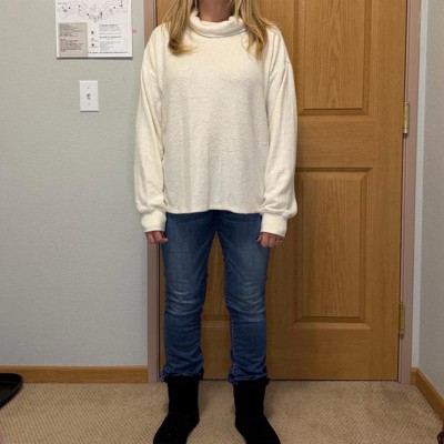 [This review was collected as part of a promotion.] This pullover is so soft. I love the feel of the fabric. It is oversized so definitely try it before you buy it. I ordered a small my normal size but I think I need to try a size smaller. The color is a winter white and looks super cute with black leggings. I think I will pair it with knee high boots too. The sweater is light weight so you may need to wear something underneath for the cooler months.
