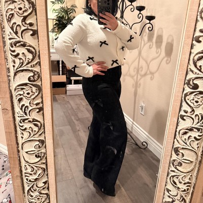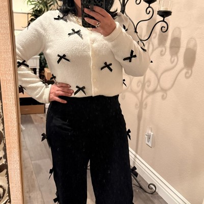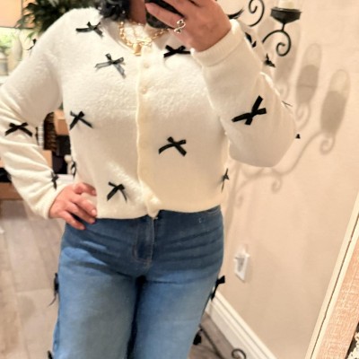 I ordered the Cream with black bows. The sweater is very pretty and super soft. Would make a great holiday outfit with black velvet pants or skirt. Unfortunately, the sweater is quite short. More of a cropped cardigan which does not work for me.