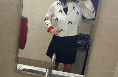 Very cute and can be layered, worn closed by itself or unbuttoned as a cardigan… soft and cute! I bought it sized up in a medium the red with the red bows because it was a bit short and true to size in a small the white with black bows. I preferred it true to size.