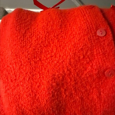 Very cute and can be layered, worn closed by itself or unbuttoned as a cardigan… soft and cute! I bought it sized up in a medium the red with the red bows because it was a bit short and true to size in a small the white with black bows. I preferred it true to size.