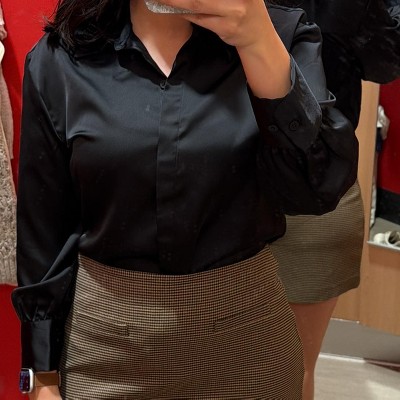 [This review was collected as part of a promotion.] I purchased this women's blouse online. This long sleeve black satin blouse is simple yet elegant. It buttons up with a nice collar and looks really polished, whether for the office or out to dinner. You will need to be careful when washing amd caring for this garment. I am wearing a size small and I would say that it fits true ro size. I typically wear a small in tops and am a 34B. I think this was priced considerably well and competitively. I am happy with this purchase and will be wearing it a lot.