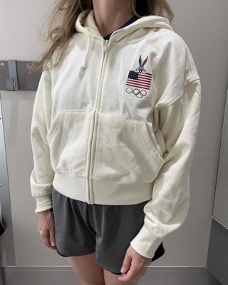 [This review was collected as part of a promotion.] My wife was super excited to see the sweatshirt because she loves the Olympics. The Bugs Bunny character on the sweatshirt was an added bonus to it. She is around 110 pounds and she tried the size small and it fit her well. The only thing she didn’t like was the length, it was not cropped, but she does like sweatshirts a little bit longer, but overall, it is a nice sweatshirt. It is nicely made, the material is soft and the Olympics graphic is awesome. I received an incentive to write this review.