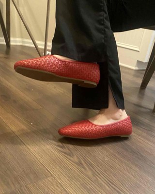 These woven flats are really cute. Im a solid 8 and the 7.5 fit me just fine. So i would size down 1/2 a size. The color is a nice modern red.