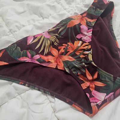 Love the stretch of these cheeky bikini bottoms as well as the colorful print! The print is floral on a burgundy background. They are low rise and don’t sag in the front or back. Comfortable fit around the thighs and waist. Material is soft.