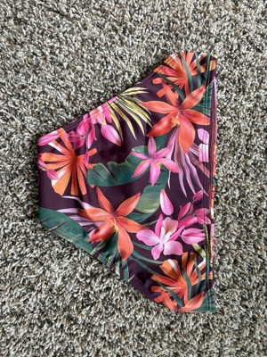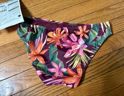 Love the stretch of these cheeky bikini bottoms as well as the colorful print! The print is floral on a burgundy background. They are low rise and don’t sag in the front or back. Comfortable fit around the thighs and waist. Material is soft.