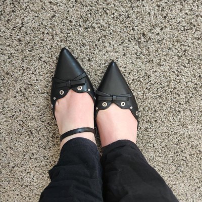 [This review was collected as part of a promotion.] I love these black kitten heels with Bo detail on the front of them. They are so cute and so comfortable. They are really easy to slip out and slip off. I also love that there is a smaller heal so it definitely dresses them up but stay is super easy to walk in. I would say they are true to size as I am wearing a size 7. I also love it it has a pointed toe, so it makes it a lot dresser and could be great for work as well. This item Felt true to size and the width Felt true to width. I received an incentive to write this review.