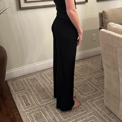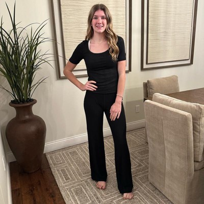 [This review was collected as part of a promotion.] My daughter is wearing these pants in the size small. She is wearing the color black. I did not expect the ribbon texture of the fabric. These do have a high waistband and I really love that. They are wide leg at the bottom and have a nice thick hem. These pants are perfect for lounging around the house. They are probably not appropriate for her to wear to school. Of course, the black is a great staple to add to your wardrobe.