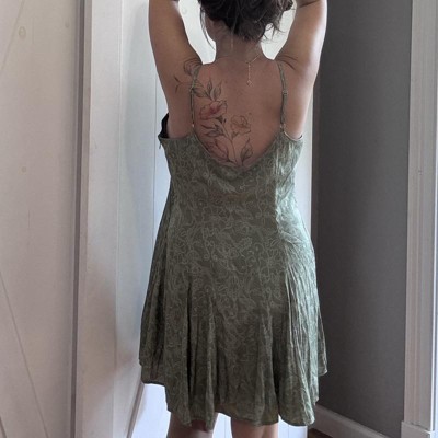 [This review was collected as part of a promotion.] This dress is photographed in a size large. This dress runs large in size and I would recommend size down if you want more base that look. This mini style dress is a slip type dress that is very thin material but very soft. The material is an olive green with a super trendy pattern. The top he’s down. The straps are a thin spaghetti style strap. This dress would be cute for a day out. I received an incentive to write this review.