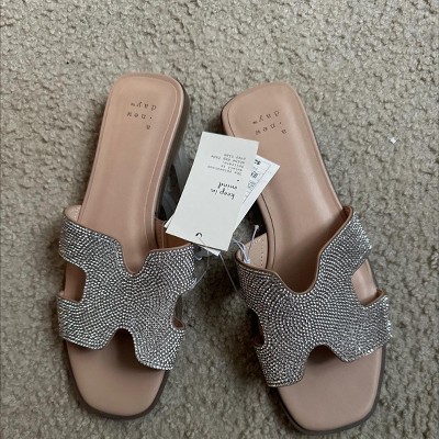 Add glamorous shine to your outfits with these Nina Rhinestone Flat Sandals from A New Day™. These faux-leather flat sandals feature a breezy open toe and back design that's enhanced with a sparkly rhinestone-embellished strap running across the front. These comfy flat sandals come with a textured outsole and a slip-on style for ease of wear. Pair them with everything from maxi dresses to jumpsuits for effortless styling wherever you go.