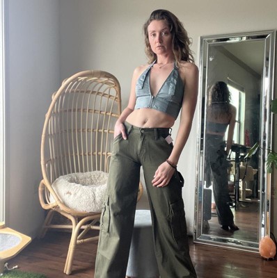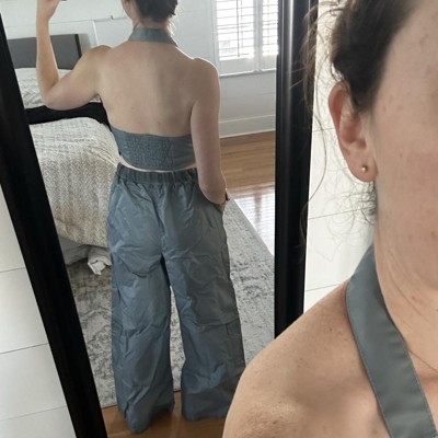 Halter tank top from Wild Fable™ in light teal blue with a hook-and-loop strap. Designed with a flattering deep V-neckline and front quarter-length zipper fastening. Tailored in a fitted silhouette with a smocked back panel and a cropped length. Made from lightweight recycled nylon for comfortable all-day wear.