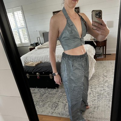 Halter tank top from Wild Fable™ in light teal blue with a hook-and-loop strap. Designed with a flattering deep V-neckline and front quarter-length zipper fastening. Tailored in a fitted silhouette with a smocked back panel and a cropped length. Made from lightweight recycled nylon for comfortable all-day wear.