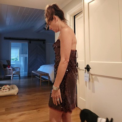 Great dress. The fit is very comfortable and flattering in my usual dress size. Love the open back with the adjustable crisscross spaghetti strap, took a bit to get the perfect look. Love the cowl neck line. I'm a big fan of the transparent Paillette design which gives it an elevated look. I purchased the Burgandy my favorite color and it looks very rich in person. Definitely recommend.