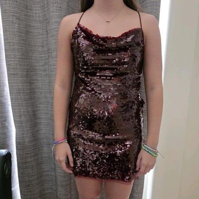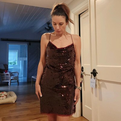 Mesh mini sheath dress from Wild Fable™ embellished with a seamless layer of paillette sequins. Features a cowl-neck front, slender shoulder straps and a crisscross with a adjustable string tie fastening. Made from extra-lightweight recycled polyester for all-day comfortable wear. Side zipper completes the design with a sleek look and fit.