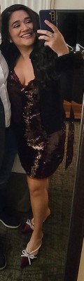 Burgundy is one of my favorite colors and I love the sheer Paillettes which give it an elevated look. My usual Wild Fable dress size is a perfect fit. Great night out/party look.