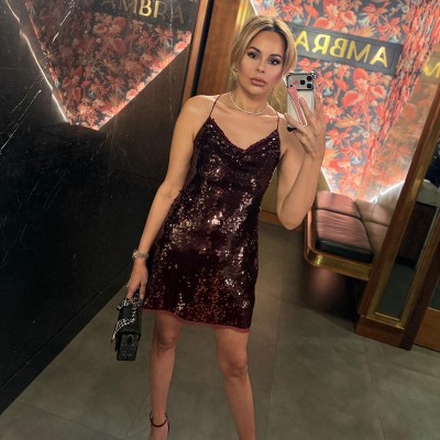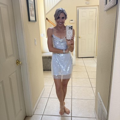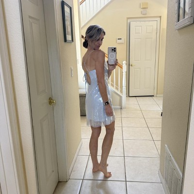 Ordered both the light blue and plum, small and medium. Beautiful colors. Trying on very carefully, several sequins fell on the floor. The sequins on the dress were laying many different directions, I think dependent on how many people tried them on & pre-bent them; they didn’t for the majority lay flat. Sequins catch the light nicely from a distance; however, they’re twice the size of typical sequins and don’t appear nice quality up close or within 6-10’ of view. The size S fit me better down to the waist (M gapped, laid odd on my back when tied). Neither fit right below the waist in back. If you’re fuller figured and/or hourglass with fuller backside, this dress can be challenging. While it’s not cheeky length like so many mini dresses, I’m 5’3/4”, average-athletic size 6, balanced hourglass figure, solid 34C, and with toned (not flat or wide) backside. Dress would’ve likely been okay to perfect length if it didn’t lift so short at my backside. Walking up any stairs with anyone right behind/below would give a show. Returned. Between the quality of the sequins and fit around the backside, not for me.