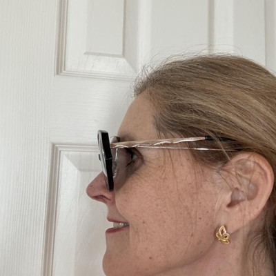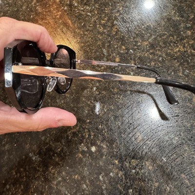 Look your stylish best on sunny-day outings with these Plastic Angular Round Wavy Metal Temples Sunglasses from A New Day™. These plastic sunglasses will elevate your look with the black frame, wavy metal temples and multicolored lenses, and the stylish round silhouette looks great with casual and dressier ensembles alike. Plus, UV protection helps keep your eyes shielded from the sun.