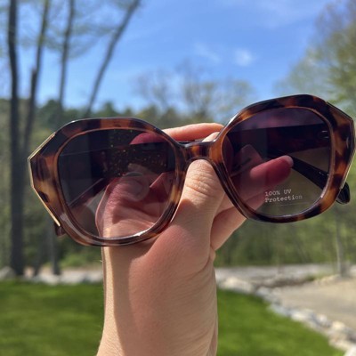 Look great without squinting through sunny outings with these Plastic Angular Tortoise Shell with Metal Butterfly Sunglasses from A New Day™. With a brown tortoiseshell design for a stylish look, these sunglasses sport an incredible angular butterfly shape that flatters various face shapes, and they're embellished with gold finish metallic accents for added fashionable flair. The recycled plastic frame offers comfortable wear, while UV protection helps keep your eyes shielded from the sun.