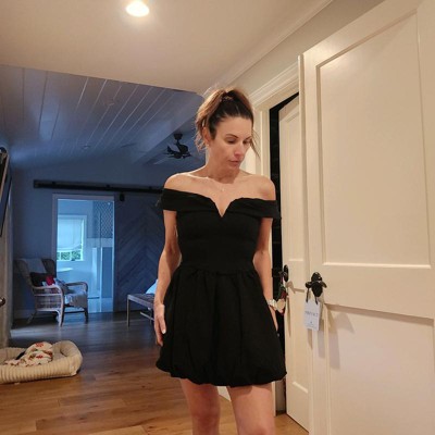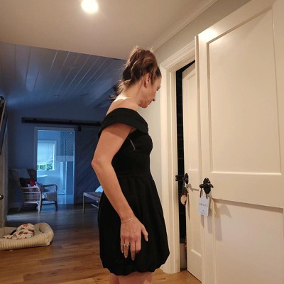 [This review was collected as part of a promotion.] I purchased this women's dress in store. This black off the shoulder cocktail dress features a deep v neck amd an adorable bubble hem. It is very short, but the bubble hem gives it a playful look and detracts from being too short. It's very flattering and fits true to size. I'm wearing a size small. I typically wear between a 2-4 in dresses. I am 5'4" and approximately 125 lbs. One of the sleeves did keep slipping lower than the other one which was kind of annoying. The price was exceptionally reasonable and I'm happy with the value. This will be a cute New Year's Eve dress.