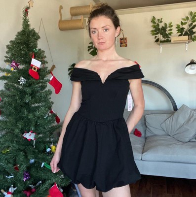 [This review was collected as part of a promotion.] I purchased this women's dress in store. This black off the shoulder cocktail dress features a deep v neck amd an adorable bubble hem. It is very short, but the bubble hem gives it a playful look and detracts from being too short. It's very flattering and fits true to size. I'm wearing a size small. I typically wear between a 2-4 in dresses. I am 5'4" and approximately 125 lbs. One of the sleeves did keep slipping lower than the other one which was kind of annoying. The price was exceptionally reasonable and I'm happy with the value. This will be a cute New Year's Eve dress.