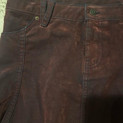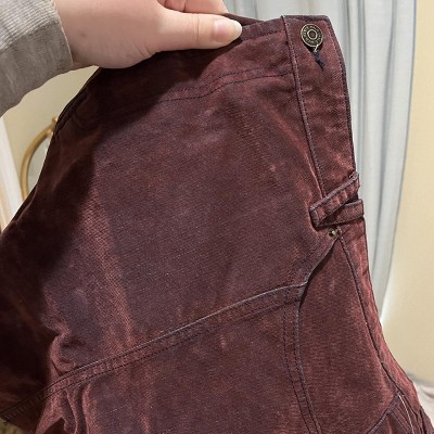 [This review was collected as part of a promotion.] This burgundy/plum colored skirt has all the fall feels. This is denim in texture and has a raw edge on the bottom. The button on the top was very hard to maneuver however, I’m hoping this is just the select one that I have. I am 5‘7“ tall and 150 pounds. I have this skirt and a size 10 and it fits perfectly. I love wearing this during the fall and matching it with all of the neutral colors in my wardrobe. I received an incentive to write this review.