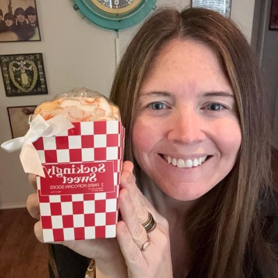 [This review was collected as part of a promotion.] I’m wearing my normal size which is a size one size fits all. I am a size 7 in women’s shoe. These popcorn socks come as a gift pack and a stylish popcorn gift bag. There is one fuzzy pair of popcorn, kernel socks. The other is regular socks with movie night themed designs on them. If you have somebody who loves popcorn or movies, it’s a great gift.